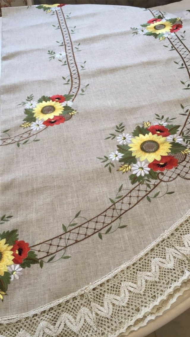 Скатертина овал лляна вишита сірого кольору з мереживом 316*180см