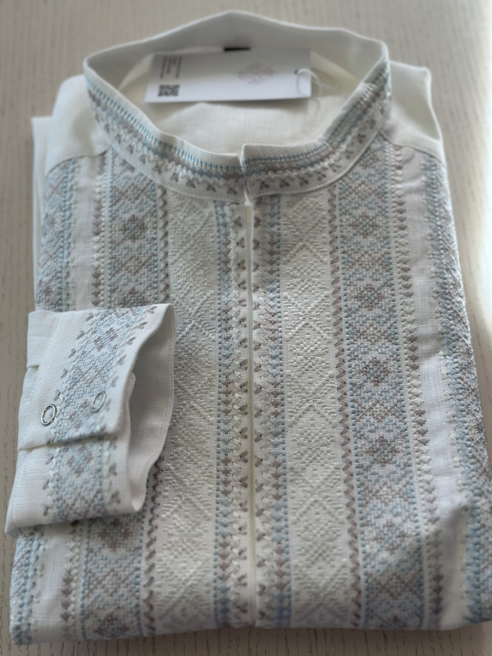 Чоловіча вишиванка пошита з натурального льону,з коміром- стійкою.Манжети застібаються на кнопки. Техніка виконання: машинна вишивка У візерунках сорочки переважають геометричні орнаменти .Основні елементи вишивки; ромби. трикутники . Цікавий орнамент символізує чоловічу енергію, розвиток та життя. Вишиванка має магічне значення і живить чоловіка силою та розумом. Справжня українська вишиванка не залишить Вас байдужими і стане справжнім